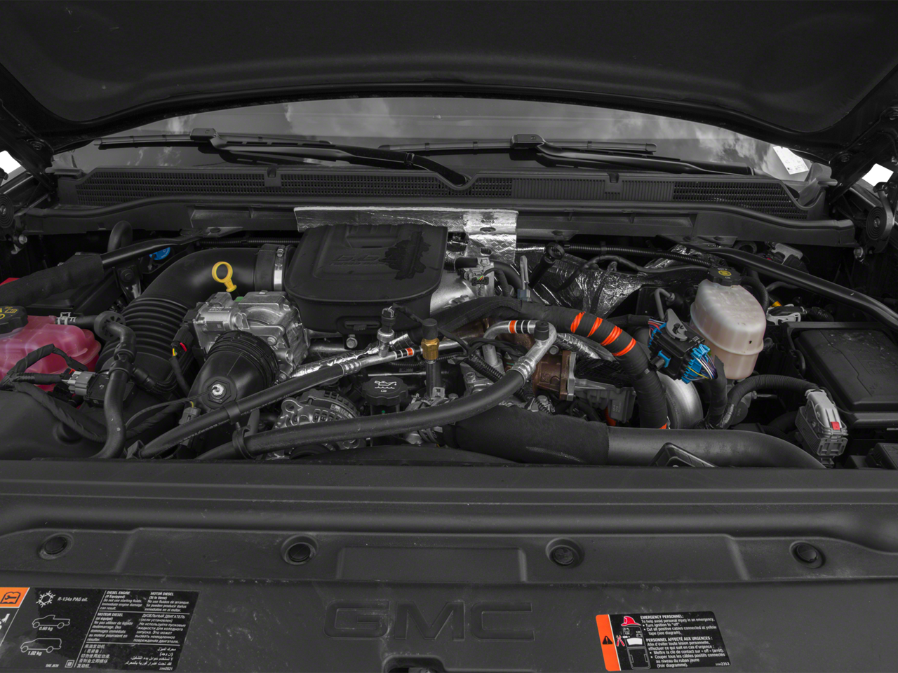 Driver Alert Package. Duramax Plus Package: Duramax 6.6L Turbo Diesel V8 Engine; Allison 1000 6-Speed Automatic Transmission with Overdrive. Preferred Equipment Group 5SA: EZ-Lift and Lower Tailgate; Leather Wrapped Heated Steering Wheel; Chrome Door Handles; Rear Vision Camera with Dynamic Guide Lines; Rear 60/40 Folding Bench Seat (folds Up); Perforated Leather-Appointed Seat Trim; Remote Vehicle Starter System; Power Sliding Rear Window; Ultrasonic Front and Rear Park Assist; Front Body-Color Bumper; Electric Rear-Window Defogger; Unauthorized Entry Theft-Deterrent System; AM/FM Stereo with 8" Diagonal Color Touch Navigation; Trailering Equipment; 110-Volt AC Power Outlet; Front Halogen Fog Lamps; 150 Amps Alternator; Steering Wheel Audio Controls; Universal Home Remote; Color-Keyed Carpeting Floor Covering; Power Windows; OnStar 6 Months Directions/Connections; 8" Enhanced Driver Instrument Information Display; Remote Keyless Entry; Electronic Shift Transfer Case; Single-Slot CD/MP3 Player; Bose Speaker System; Color-Keyed Carpeted 1st and 2nd Row Floor Mats; Deep-Tinted Glass; Front Full Feature Bucket Seats; Chrome Power-Adjustable Heated Outside Mirrors; Spare LT265/70R18E AS BW Tire; 18" Chromed Aluminum Wheels; Dual-Zone Automatic Climate Control; Manual Tilt-Wheel/telescoping Steering Column; Driver and Front Passenger Visors; Front Frame-Mounted Black Recovery Hooks; OnStar with 4G LTE; Rear Body-Color Bumper with Bumper Cornersteps; Auto-Dimming Inside Rearview Mirror; Power Adjustable Pedals; Rear Wheelhouse Liners; Heated and Cooled Driver and Front Passenger Seats; Chrome Bodyside Moldings. Power Sunroof. Spray-On Pickup Box Bed Liner with GMC Logo. Off-Road Suspension Package. Composite Storage Bin Under Rear Seat. LT265/70R18E AT BW Tires. High Idle Switch. Black Front and Rear Molded Splash Guards. 3.73 Rear Axle Ratio. Trailering Wiring Provisions. **Equipment listed is based on original vehicle build and subject to change. Please confirm the accuracy of the included equipment by calling the dealer prior to purchase.**